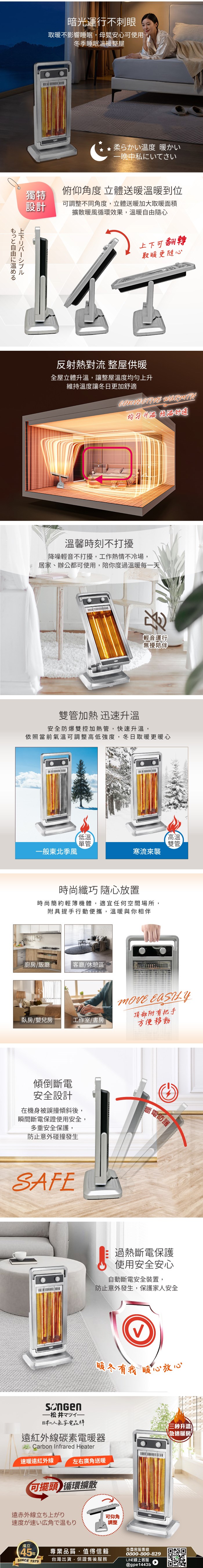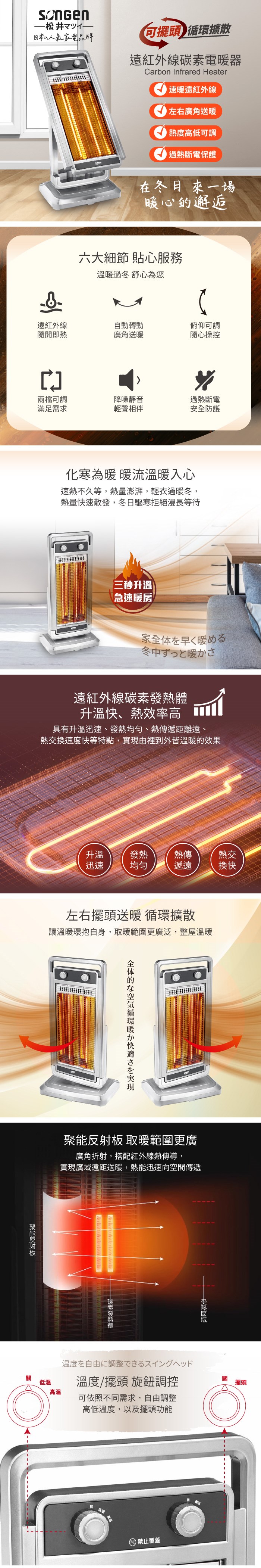 遠紅外線發熱,迅速制暖快速驅寒 俯仰角度立體送暖,大範圍取暖 可自動左右擺頭,廣角送暖 兩段式調節溫控,方便易操作 聚能反射罩,節能熱效率高 超溫自動斷電,傾倒斷電裝置