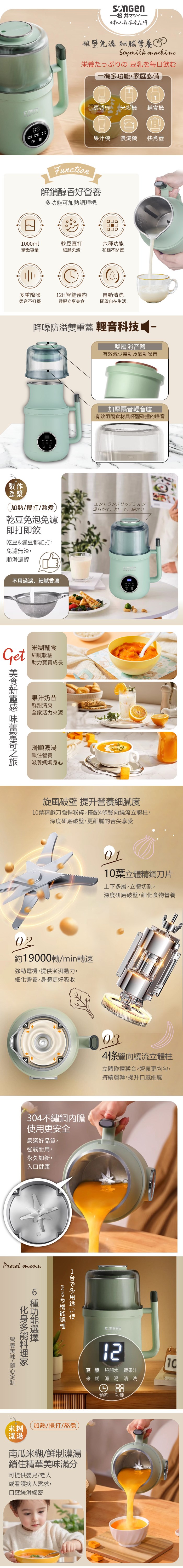 豆漿機/果汁機/調理機/開水機 無需泡豆,即打即飲,冷熱兩用 柔音防溢雙重蓋,消噪音減少震動 立體10葉精鋼刀,粉碎研磨攪打 可預約定時烹調,美味無需等待 六大功能選單,一鍵完成好輕鬆