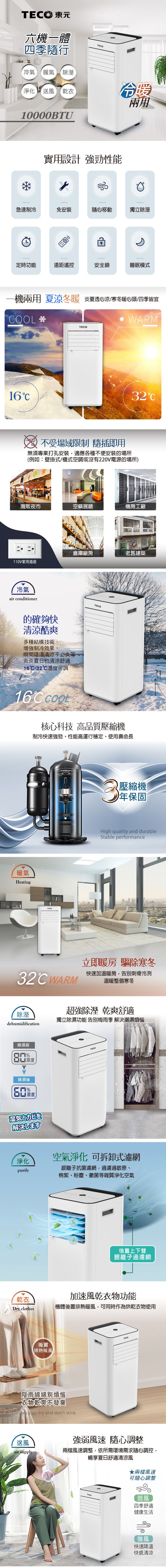 【TECO東元】10000BTU多功能冷暖型移動式冷氣機