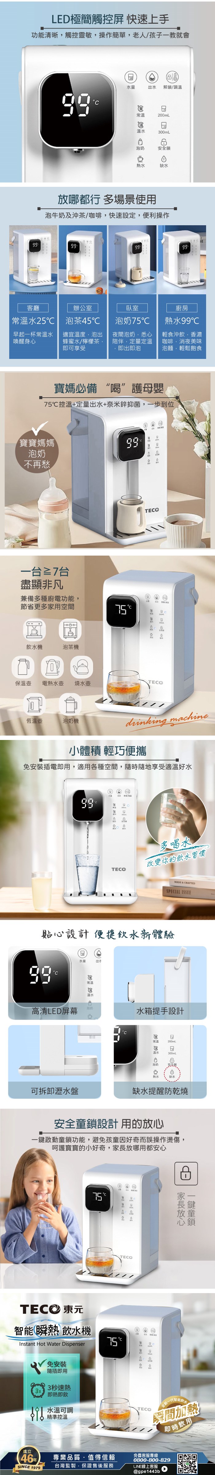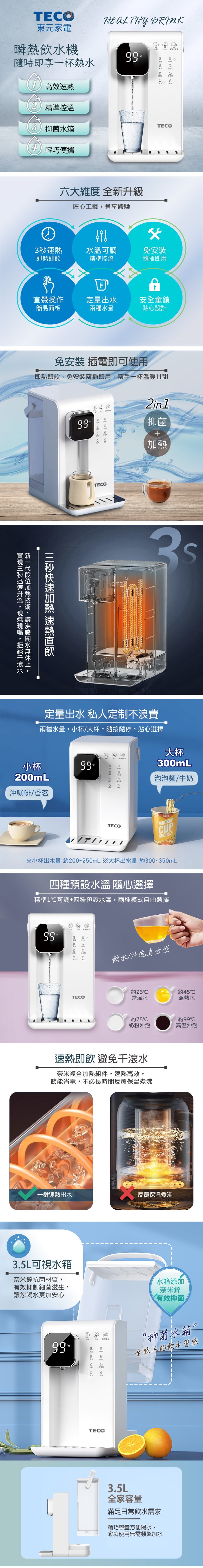 瞬間加熱,避免反覆加熱千滾水 奈米鋅水箱抑菌材質,有效抑菌 四種預設水溫,自由選擇 定量出水,貼心便捷設計 分離式手提水箱,清潔便利 兒童防燙傷安全鎖控裝置