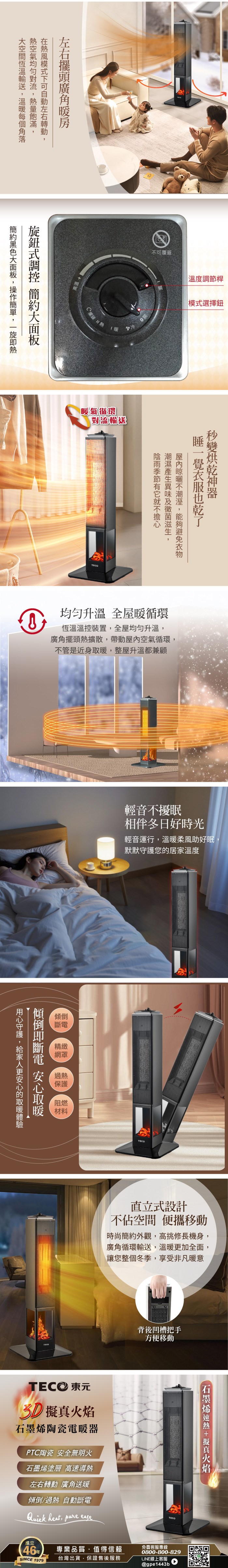 採用石墨烯+PTC陶瓷雙超導體 3D動態火焰,復刻燃燒躍動感 無光害、無噪音、無耗氧、無輻射 防傾倒裝置,安全更安心 三段強度溫度設定,暖熱可控 可左右旋轉,廣角送暖